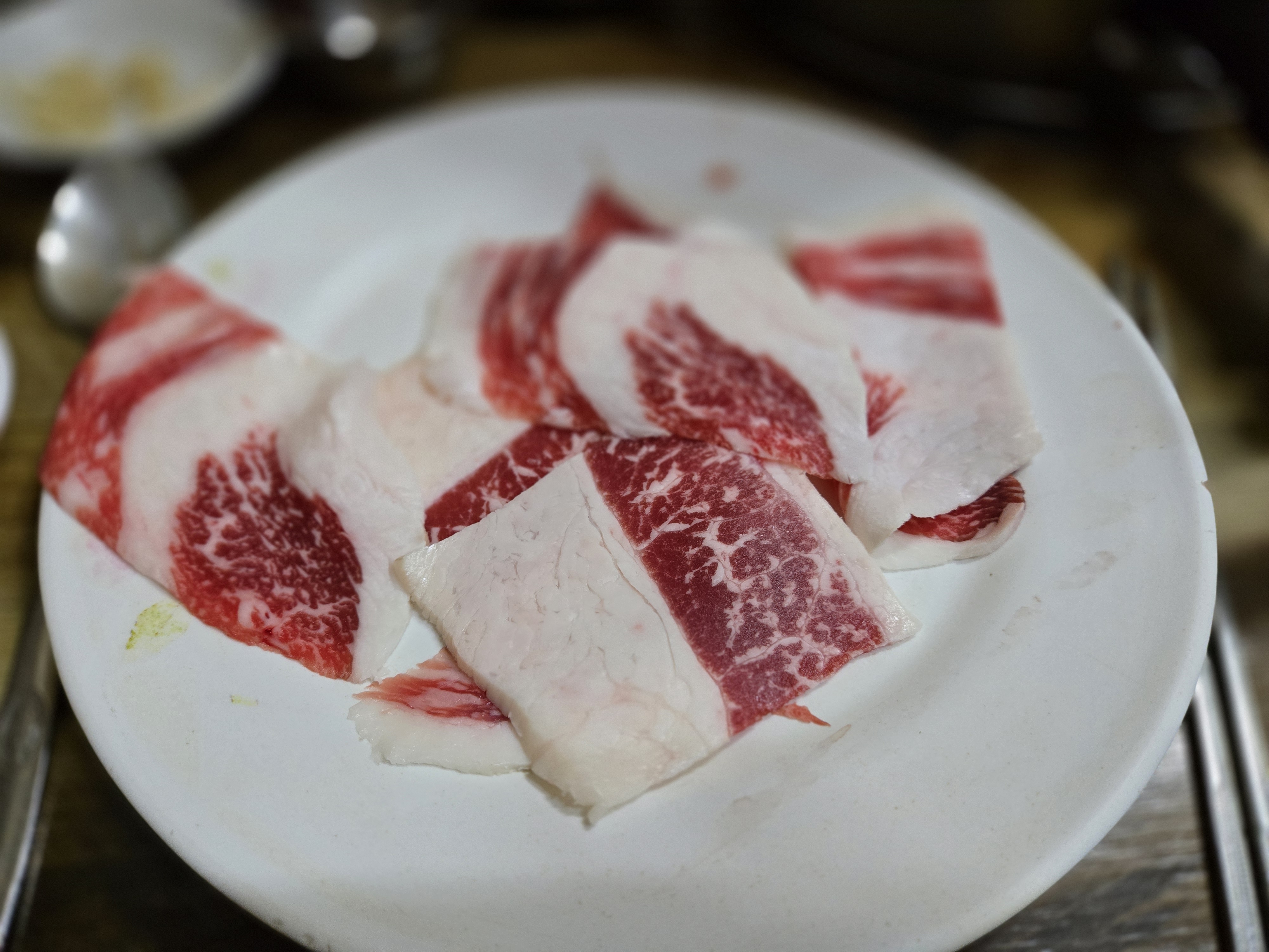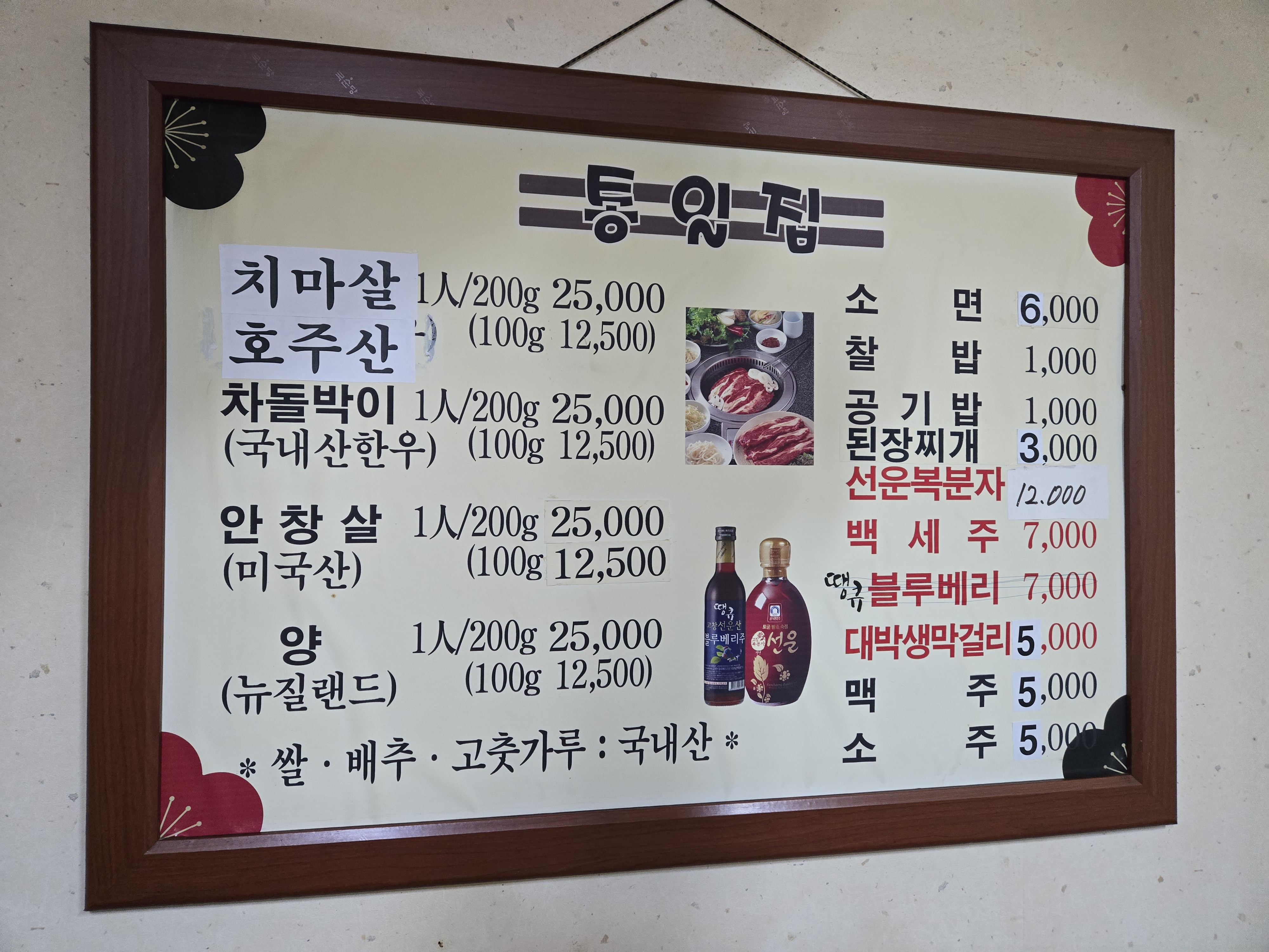 이곳의 대표 메뉴는 미국산 소고기를 특제 간장소스에 찍어 구워 먹는 방식입니다. 이날은 치마살(미국산), 안창살(미국산), 차돌박이(국내산 한우), 그리고 된장찌개를 주문했어요.