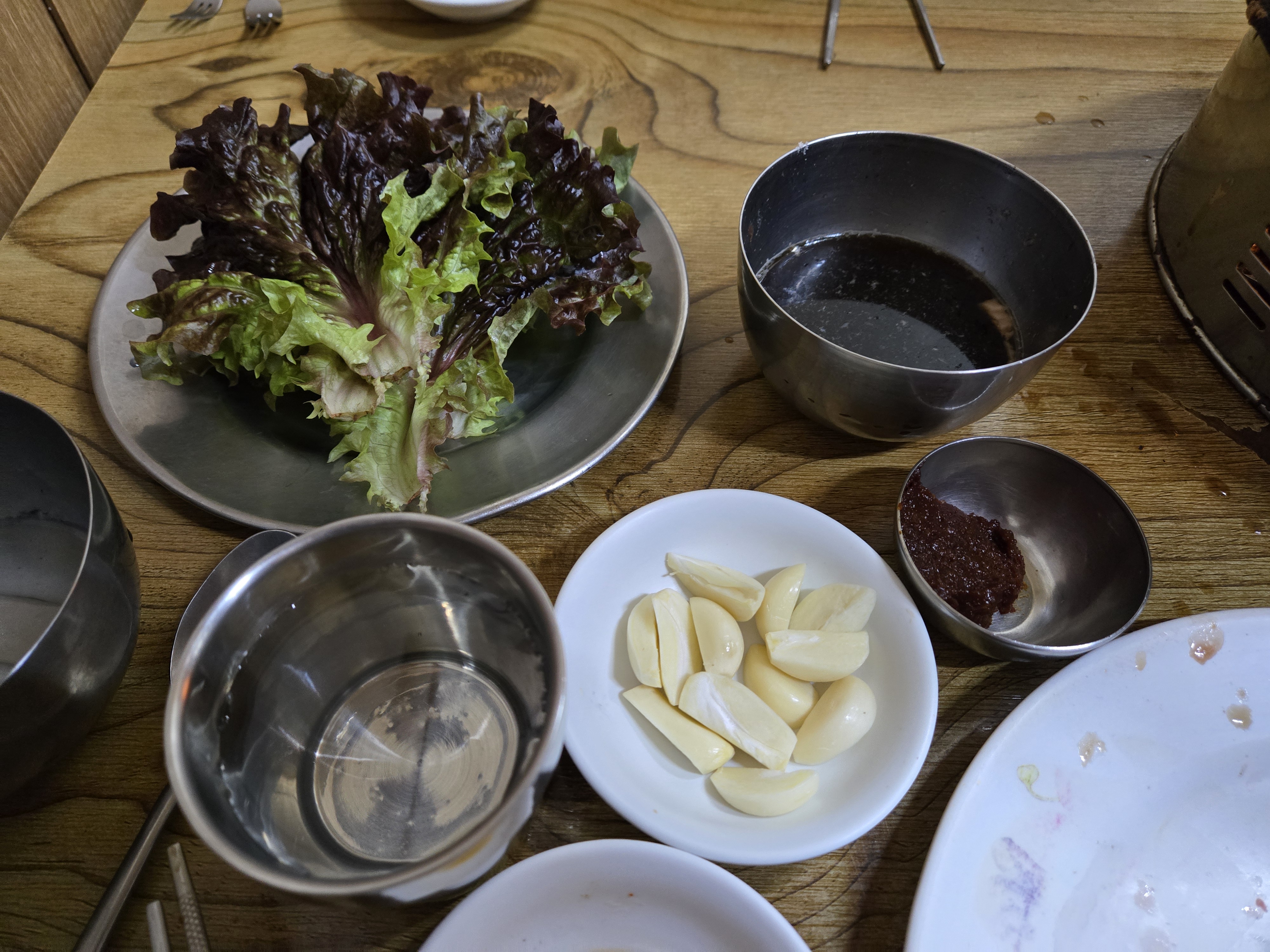 기본 반찬으로는 특제 간장 소스, 마늘, 쌈 채소, 파무침 등이 나왔어요~
