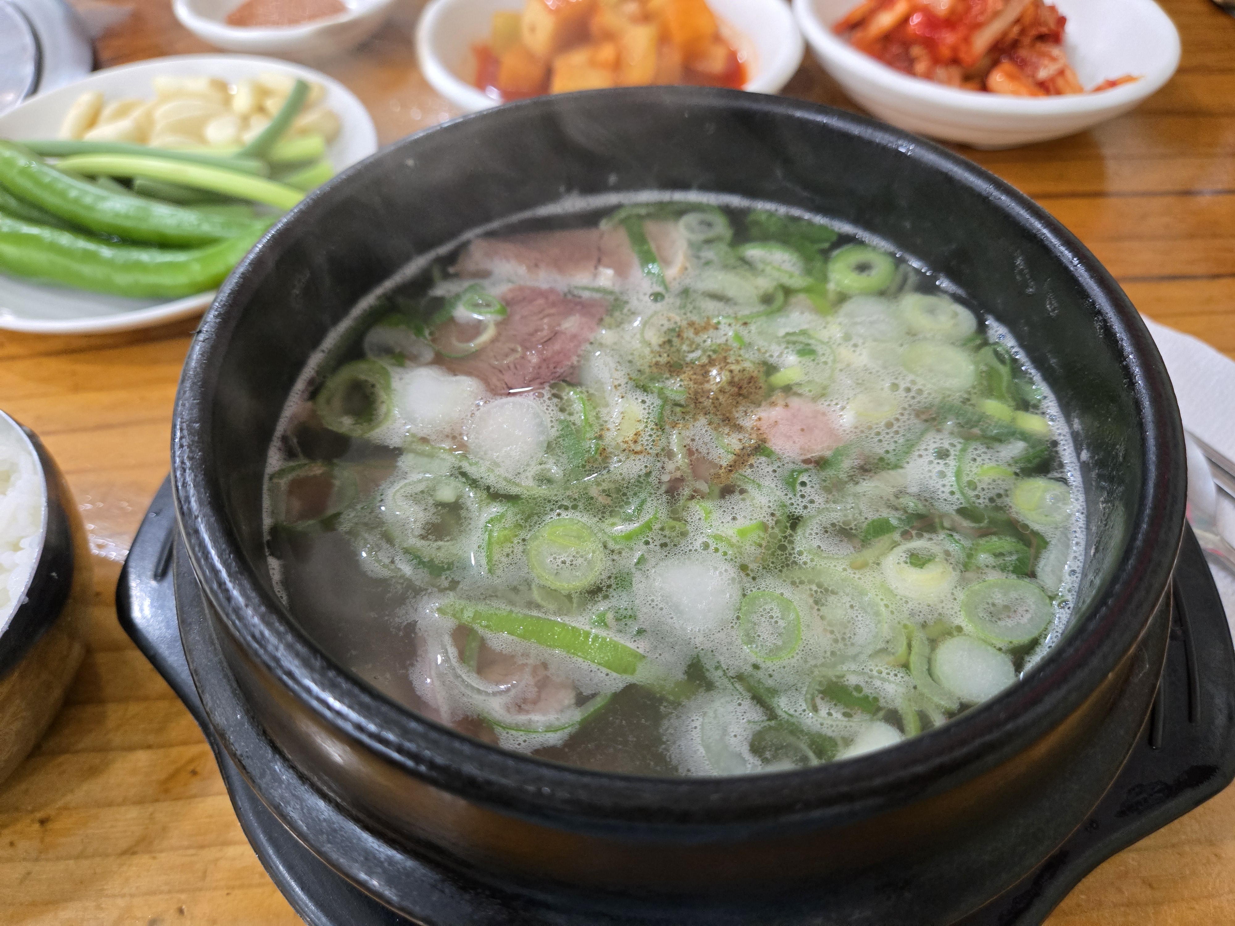 소머리국밥은 국물이 맑고 담백한 편이었는데, 고기 양이 꽤 넉넉하게 들어 있어서 와이프도 만족스럽게 먹었어요. 고기가 부드럽고 질기지 않아서 씹는 맛도 좋았고, 국물도 느끼함 없이 깔끔했어요. 전반적으로 고기 퀄리티가 꽤 괜찮은 집이었습니다. 와이프는 소머리국밥을 원래 즐겨 먹지는 않는데, 이날은 거의 다 비우더라고요.
