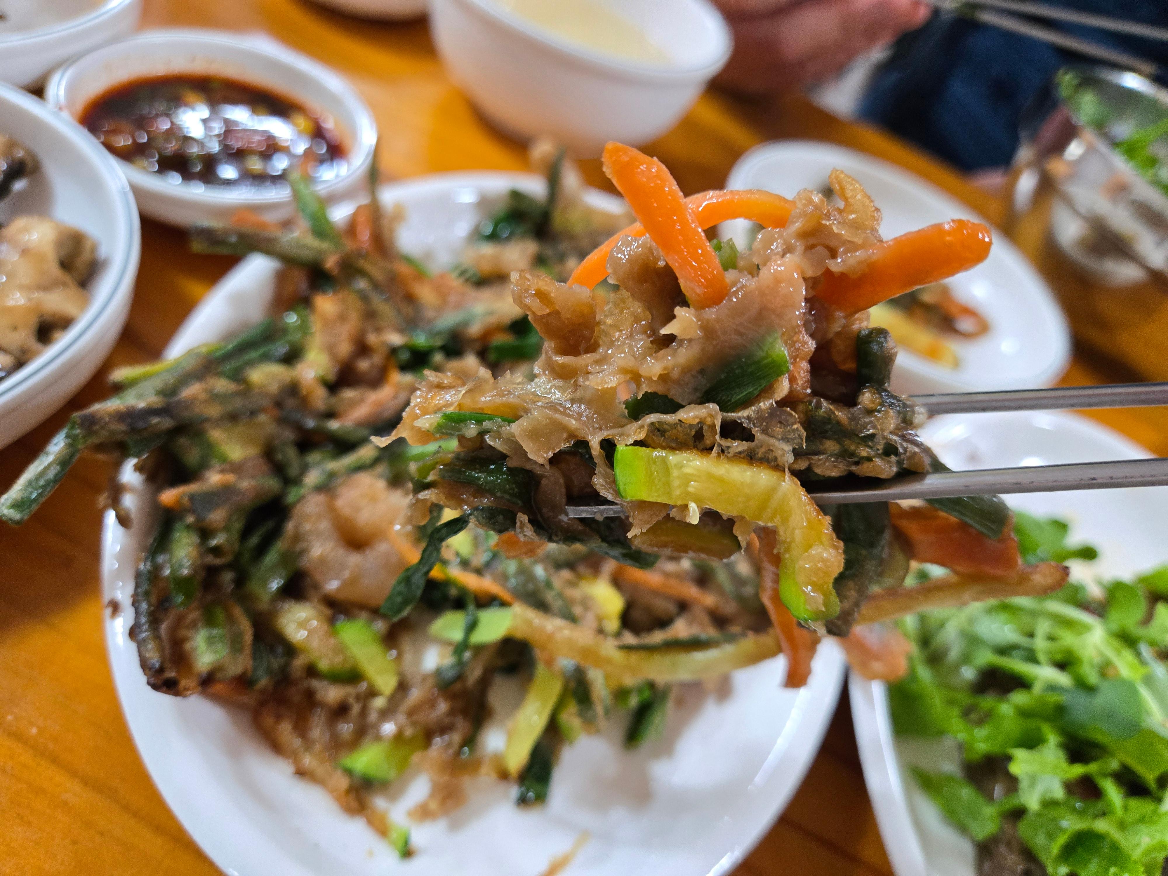 기본 반찬들도 모두 정성스러웠습니다. 도토리해물파전은 도토리 가루를 사용해 바삭함과 고소함이 동시에 살아 있었고, 해물도 넉넉하게 들어가 있어 따로 주문하고 싶을 정도였어요. 그리고 홍어무침 보쌈은 냄새 없이 잘 숙성되어 있어, 무말랭이 김치와 함께 보쌈에 싸 먹으면 별미 중의 별미였습니다. 평소 홍어를 잘 먹지만 이곳 홍어는 삭히지 않은 담백하고, 부담 없이 즐길 수 있었어요. 실제로 다른 손님들도 이 메뉴를 특히 많이 주문하고 있었는데, 식사를 마치고 나가는 손님 중 한 분은 계산하면서 “보쌈이 진짜 예술이었어요”라고 하시더라고요. 듣고 고개가 절로 끄덕여졌습니다.