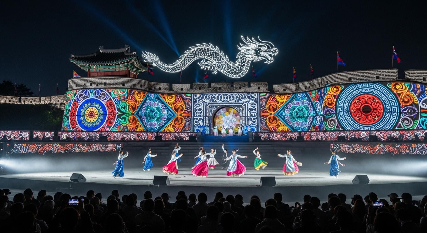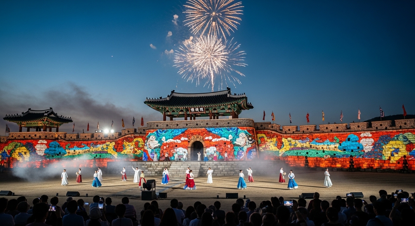 연무대 특설무대에서 10/3~10/4 19:30~20:30 진행. 웅장한 성벽 라이팅과 미디어 연출로 야간 몰입감이 뛰어납니다.