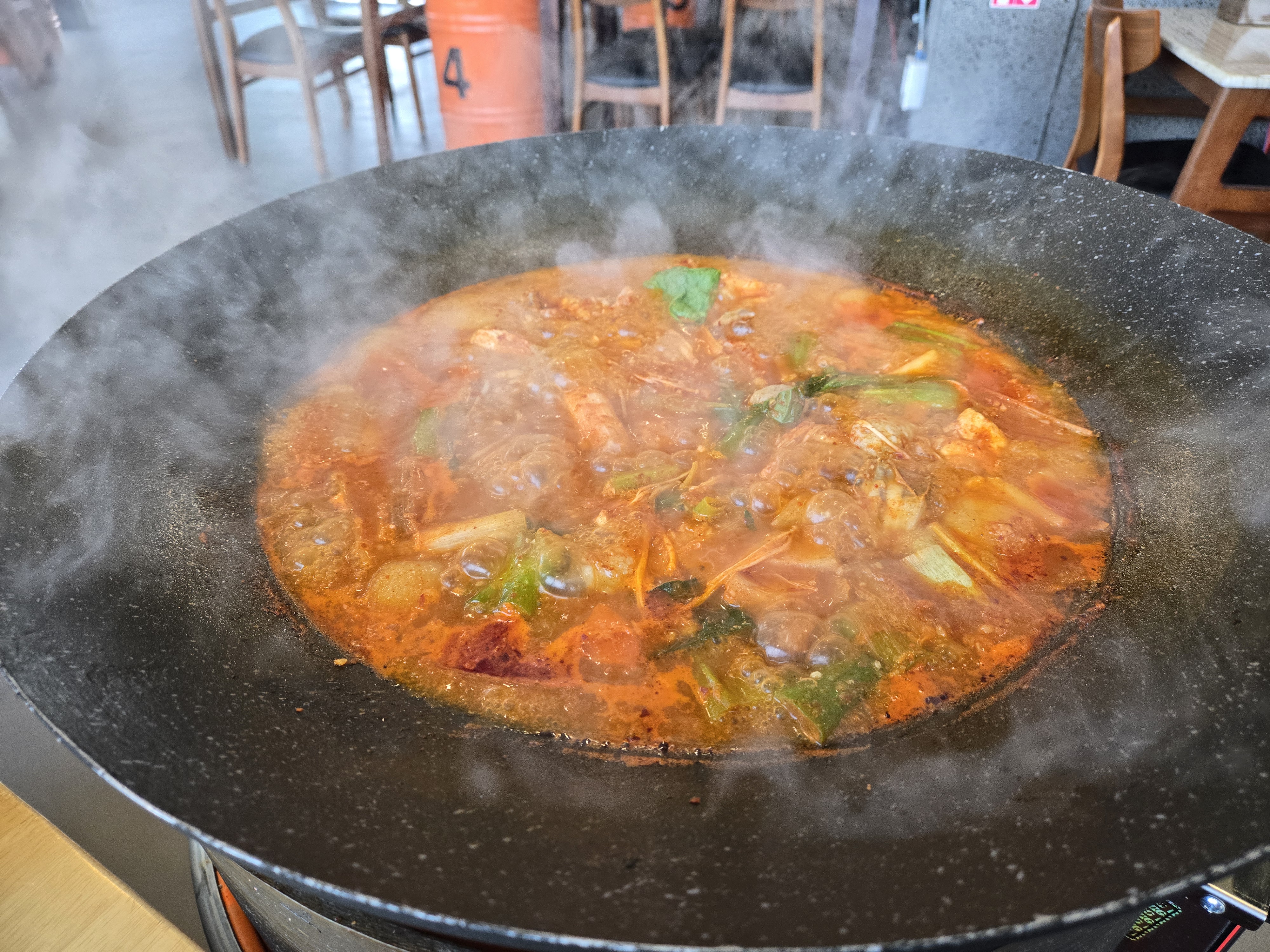 주문 후 얼마 지나지 않아 거대한 솥뚜껑이 등장했습니다. 직원분이 기본적인 조리 방법을 설명해 주셨는데, 육수를 천천히 졸여가며 양념이 고기에 잘 베이게 하는 방식이었습니다. 이때 사리들은 초기에 넣지 않고, 육수가 어느 정도 졸아든 후에 추가하는 것이 포인트였습니다. 하지만 직원분이 다해주시니까 기다렸다 드시면 돼요