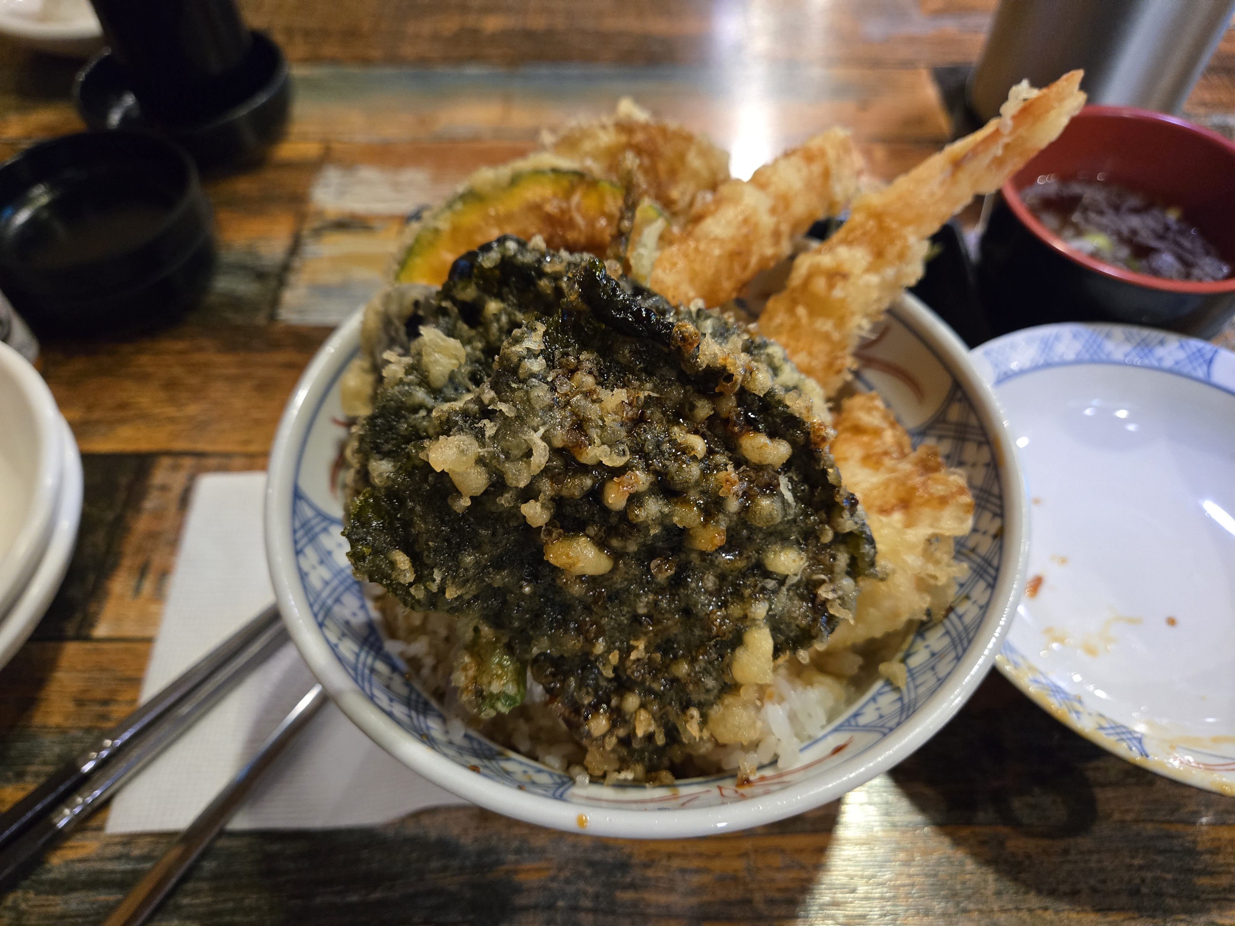 드디어 주문한 금봉스페셜텐동이 나왔다! 바삭한 튀김들이 푸짐하게 올라간 비주얼이 너무 근사했다. **김튀김, 다시마튀김, 새우튀김, 고구마튀김**까지 다양한 튀김이 한 그릇에 담겨 있어 푸짐한 느낌이었다.
