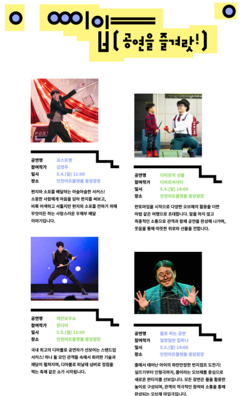 | 5/5(월) | 5/5(월) | 줄로 하는 공연 | 일장일딴 컴퍼니 |
