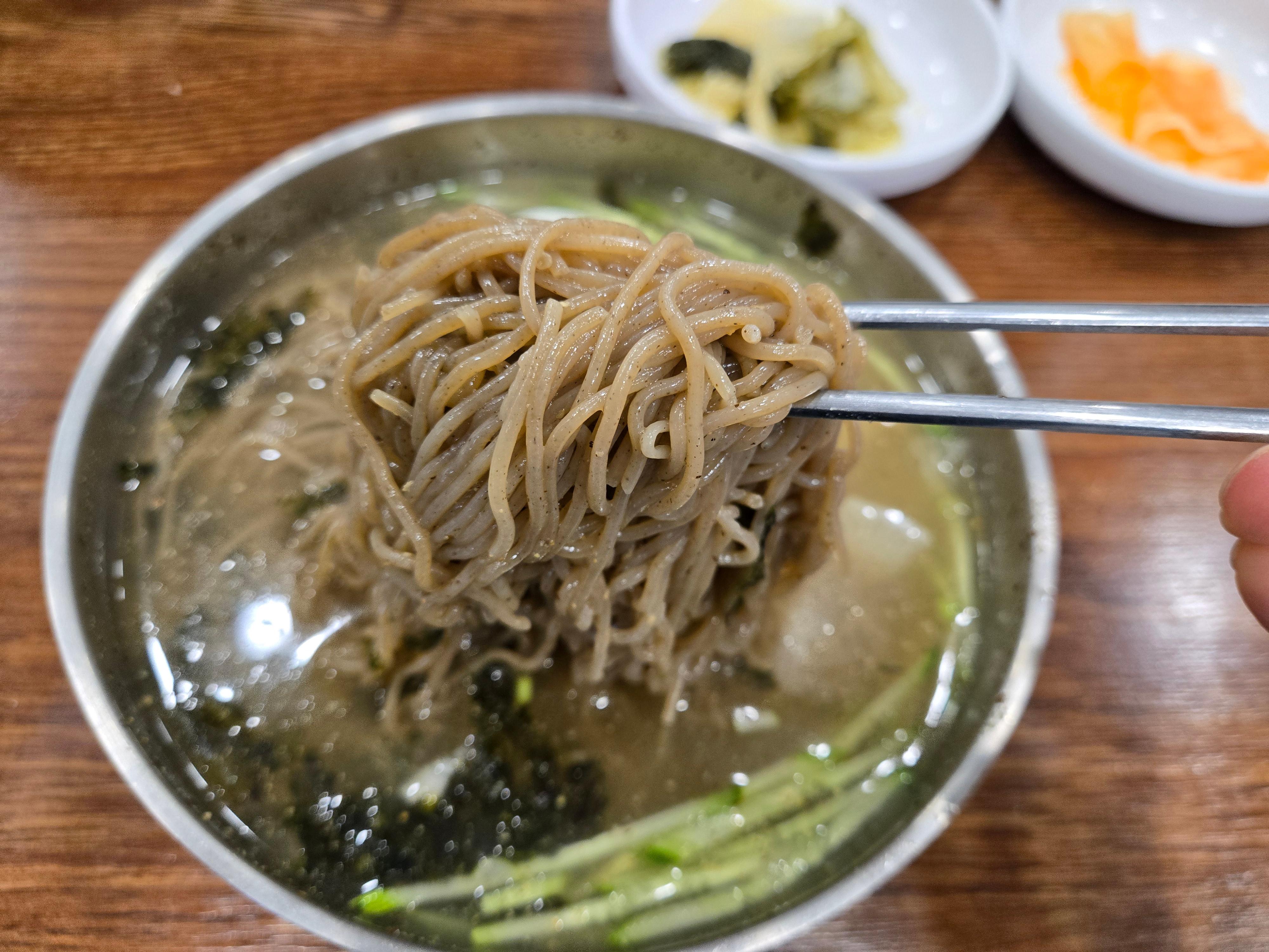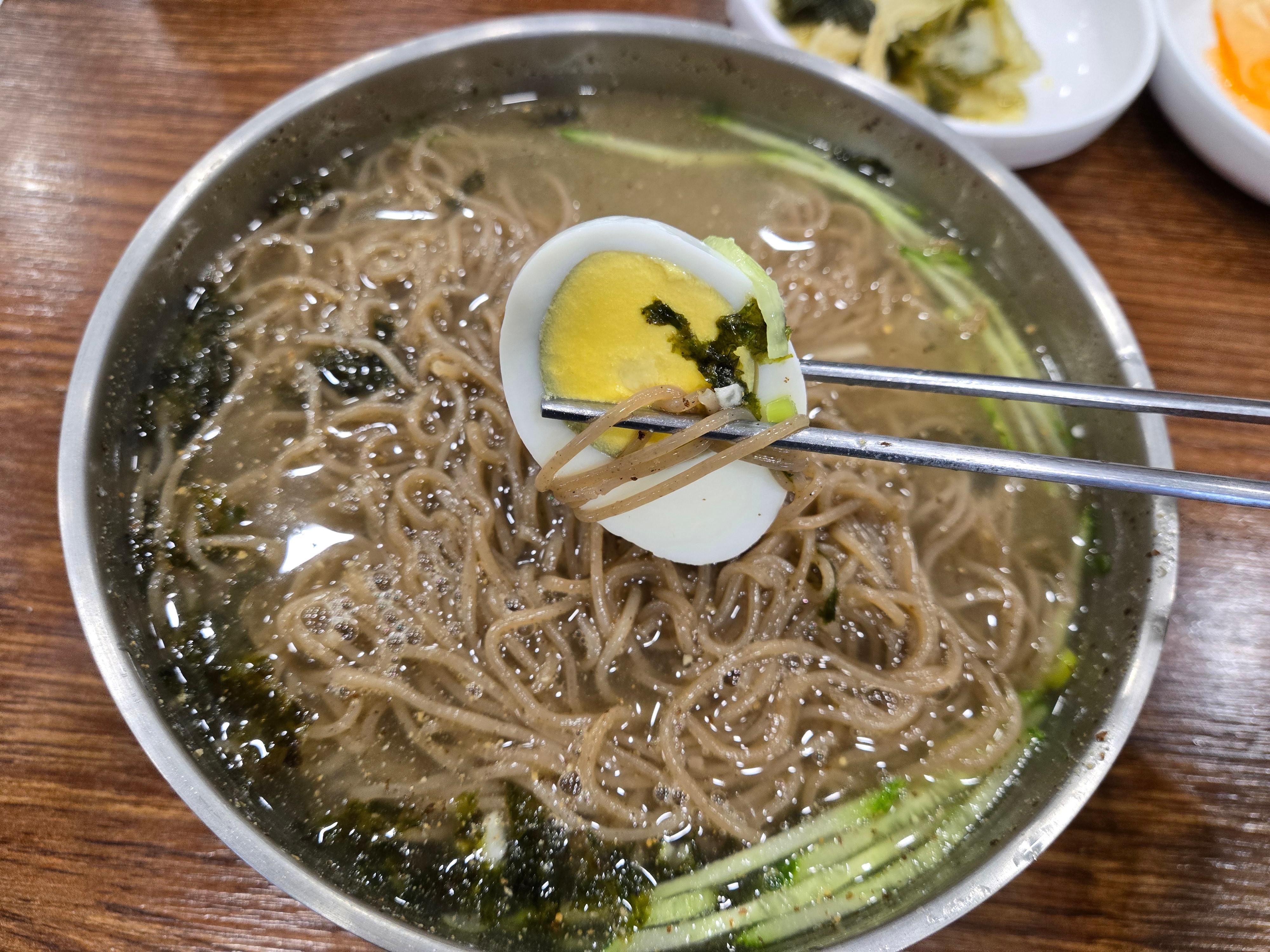 차가운 육수에 담긴 메밀면, 그리고 그 위에 놓인 오이, 김가루, 삶은 달걀, 들깨가루. 자칫 흔해보일 수 있는 조합이지만, 한 젓가락 먹는 순간 “아, 이건 다르다”는 느낌이 들었습니다.