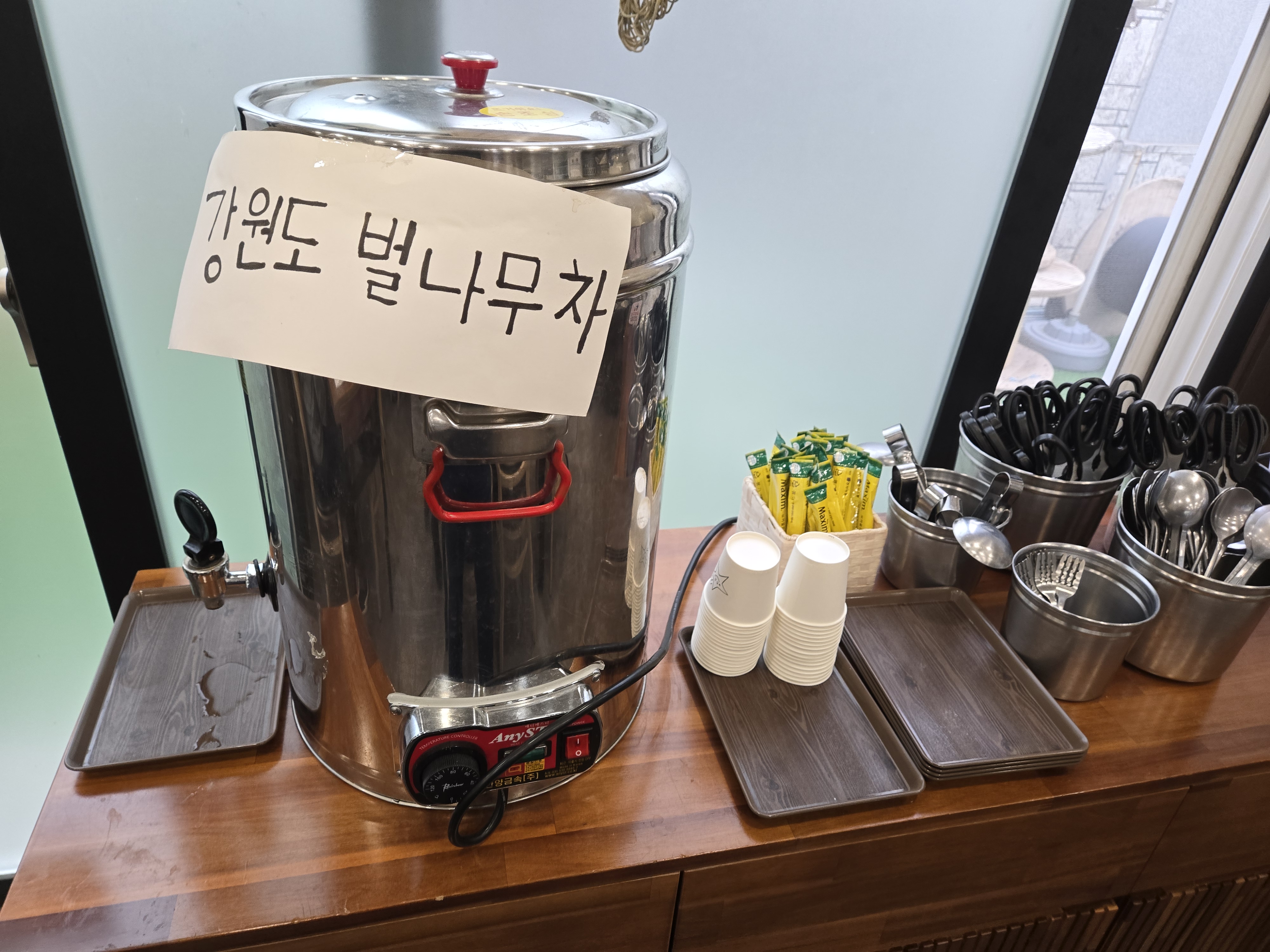 식사 후엔 셀프코너에서 제공되는 특별한 음료가 있었는데요. 바로 ‘벌나무차’입니다. 일반적인 매실차나 식혜가 아닌, 이 벌나무차는 살짝 쌉쌀하면서도 입안을 깔끔하게 정리해주는 맛이 매력적이었어요. 처음 마셔보는 분들에겐 생소할 수 있지만, 한번 맛보면 은근히 중독성 있는 차였습니다.