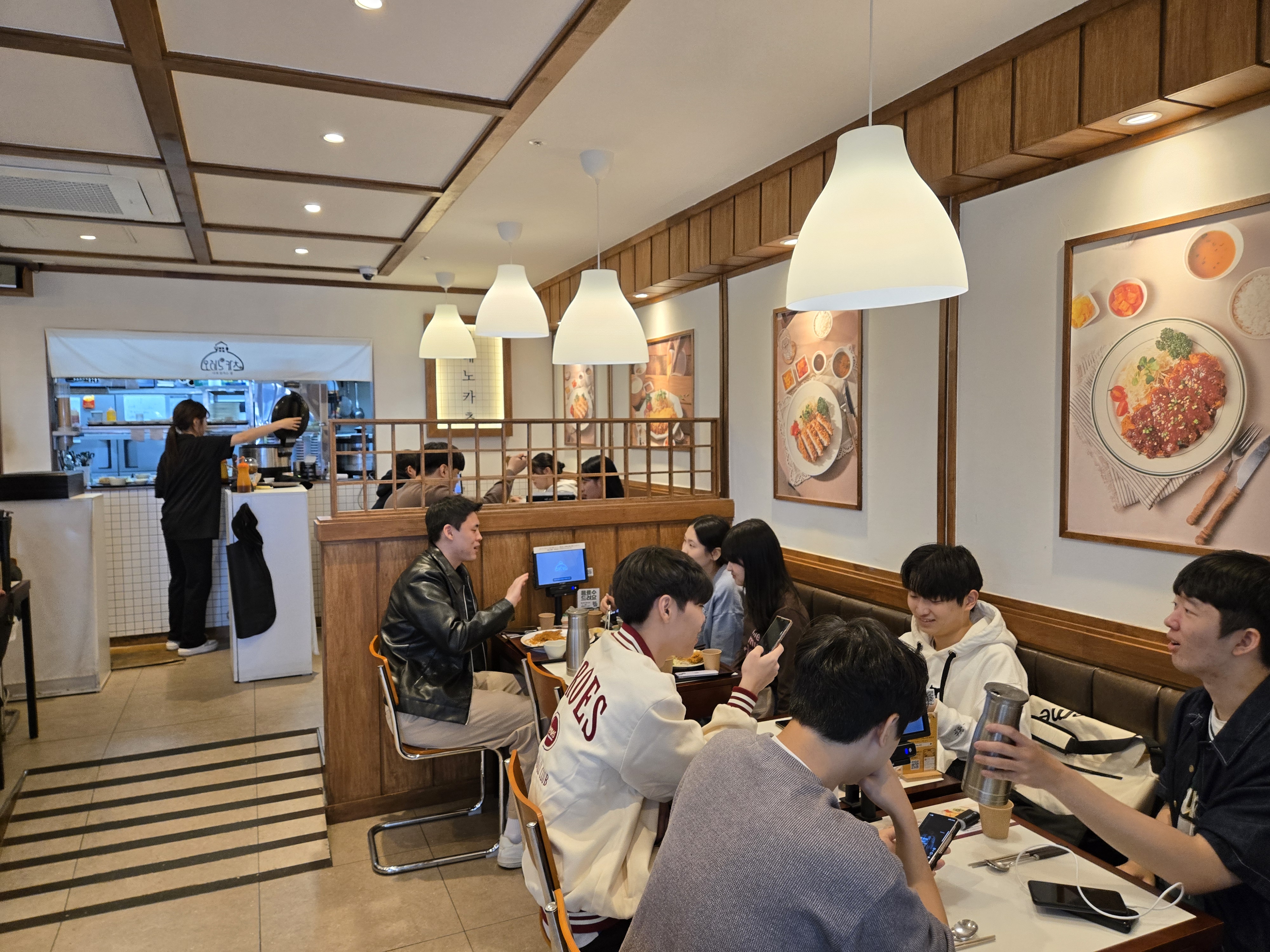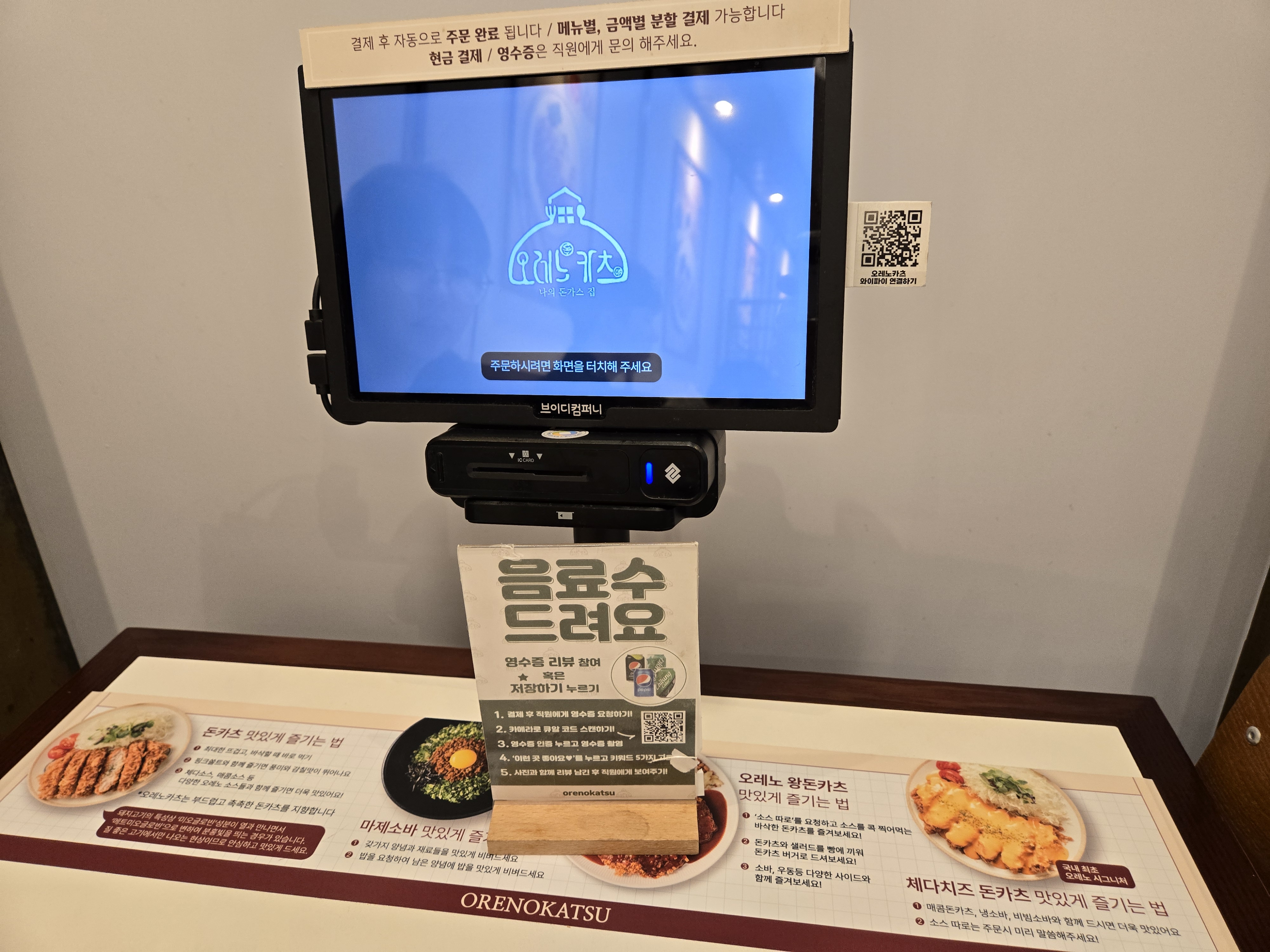 오레노카츠 내부는 널찍하고 쾌적했습니다. 테이블 간 간격이 넓어 프라이빗한 식사가 가능했고, 다양한 인테리어 소품들이 곳곳에 배치되어 따뜻한 분위기를 더했습니다. 키오스크 주문 시스템도 매우 직관적이어서 메뉴 선택과 결제가 편리했어요.