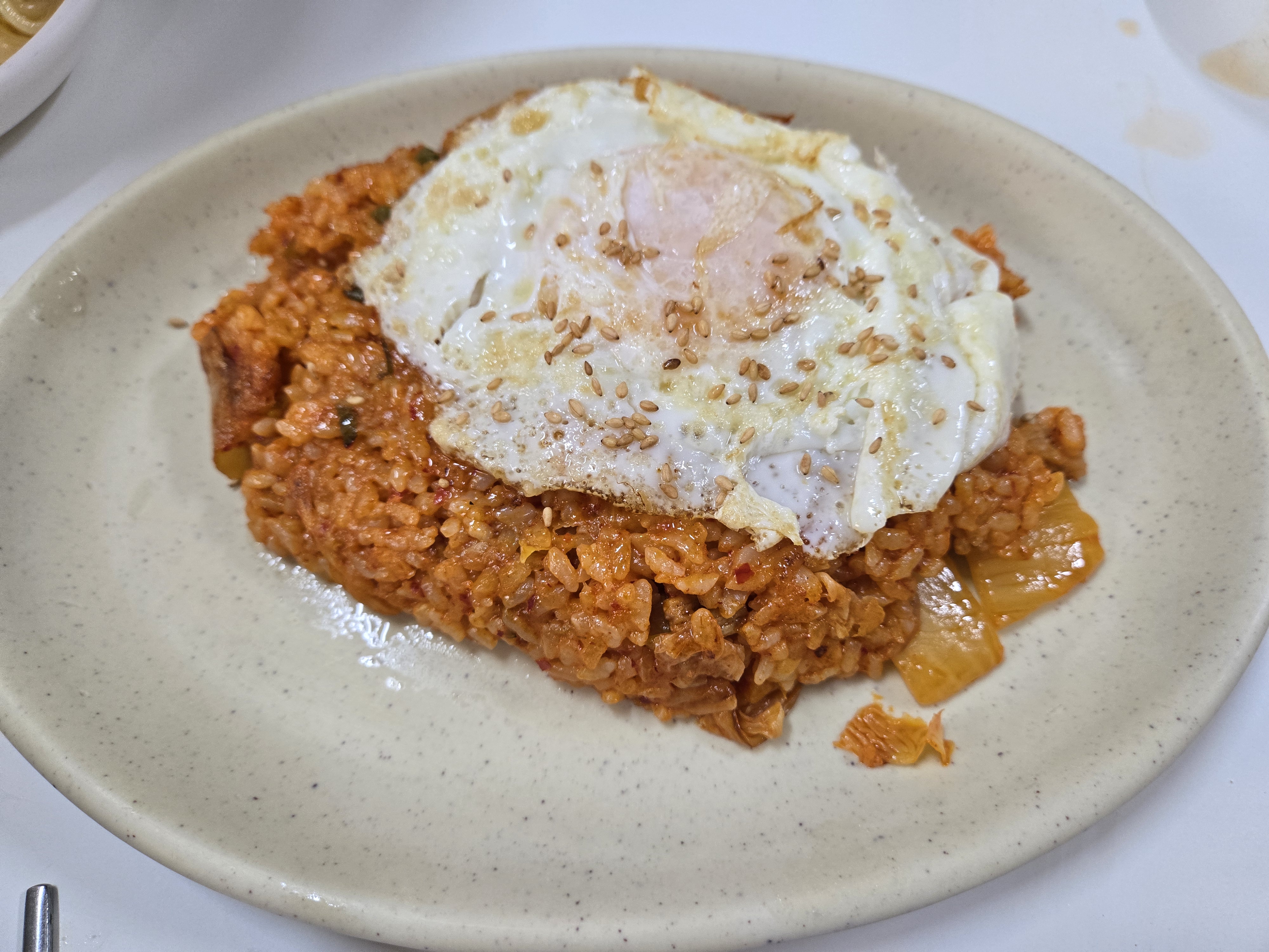 어느 정도 배가 부른 상태였지만, 김치볶음밥은 절대 놓칠 수 없었어요. 따끈한 철판에 볶아낸 김치볶음밥은 불향이 은은하게 올라왔고, 그 위에 얹어진 반숙 달걀프라이가 고소함을 더했습니다. 김치의 칼칼한 맛과 잘 어우러진 밥알은 고슬고슬해서 질지 않고, 하나하나 식감이 살아 있었어요.