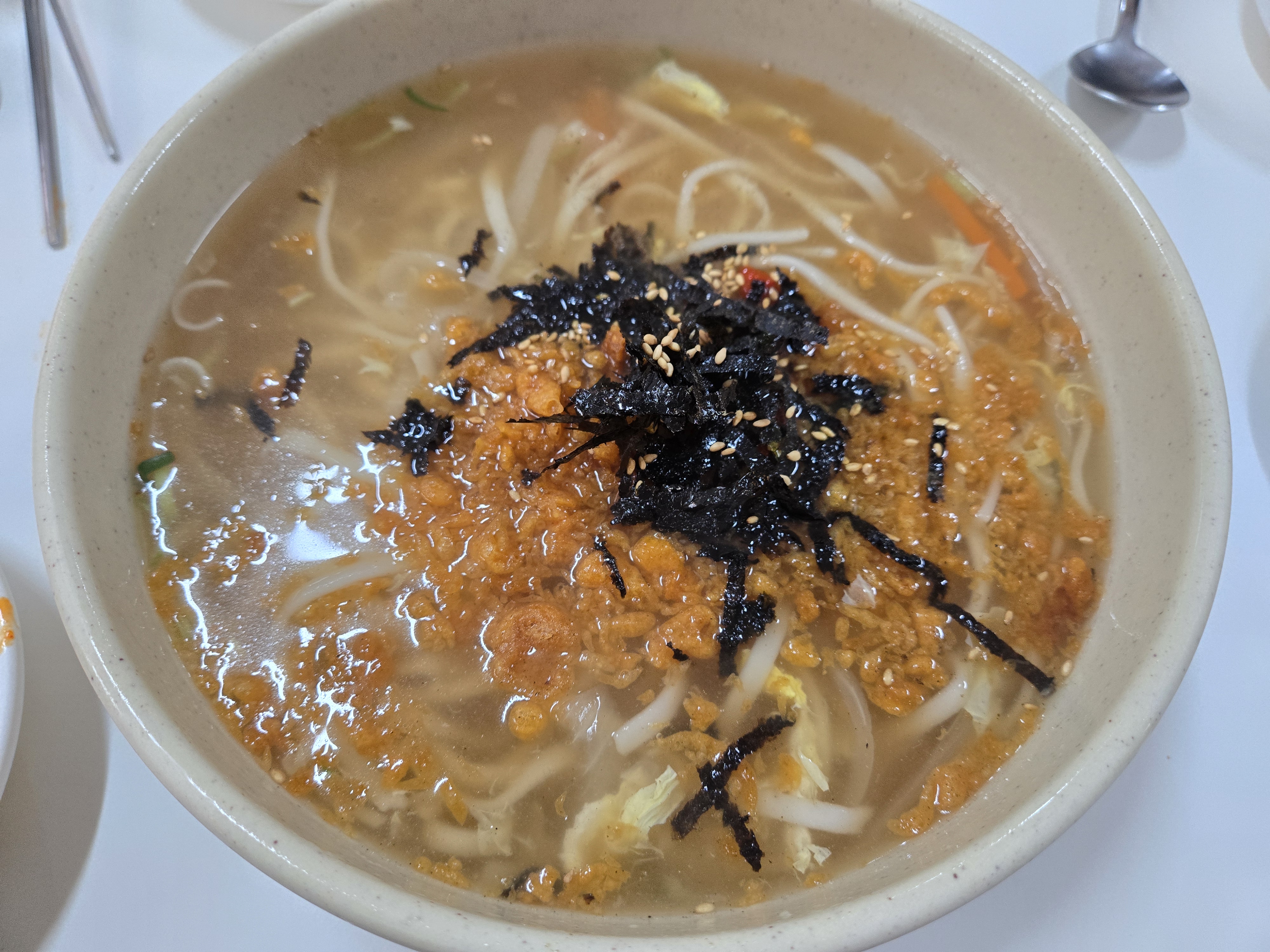 메뉴 중 가장 기대했던 칼국수는 역시나 기대를 저버리지 않았습니다. 멸치로 우려낸 깊고 진한 국물은 잡내 하나 없이 깔끔했어요. 국물 위에 뿌려진 김가루와 튀김가루가 고소함을 더해, 국물 한 숟갈에 다채로운 맛을 느낄 수 있었습니다.