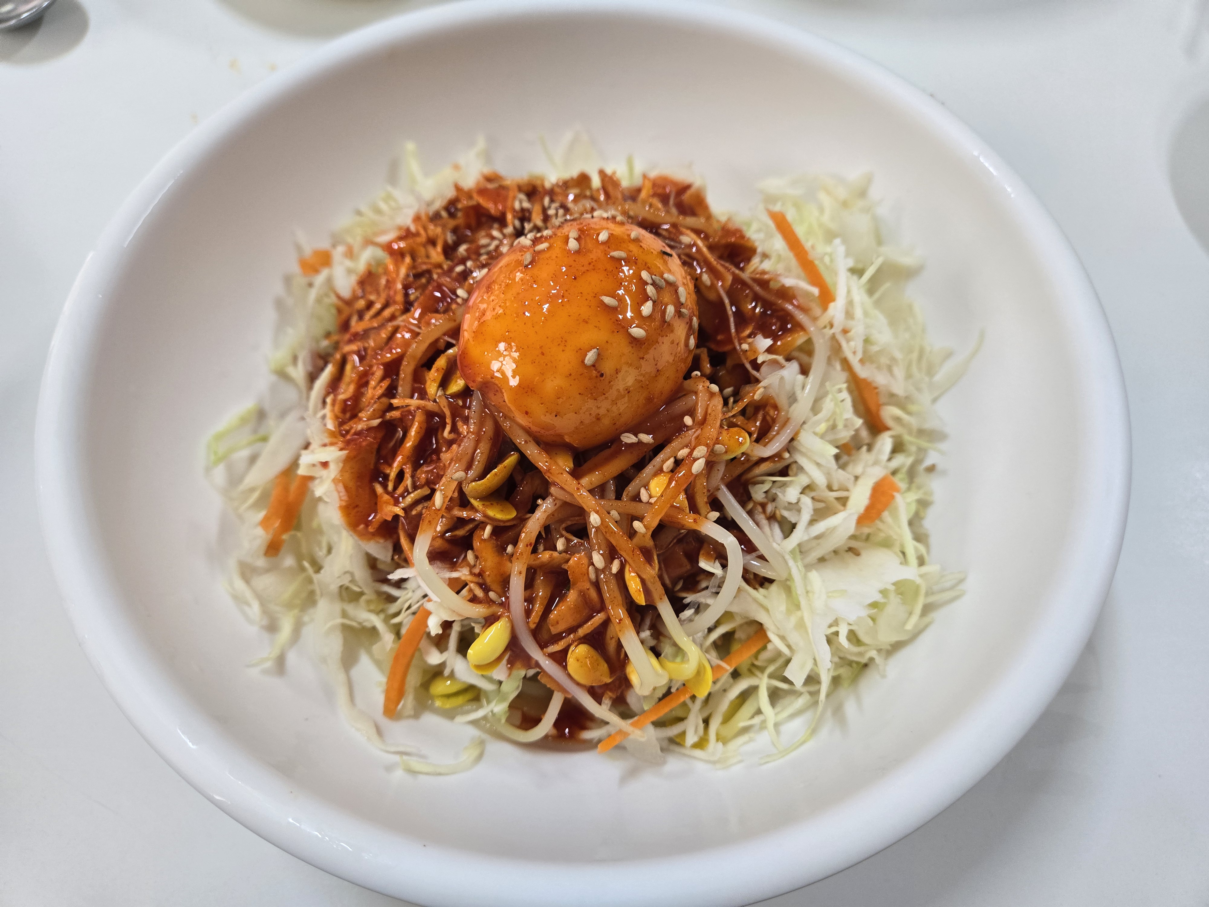 쫄면은 단순히 매콤한 맛을 기대하고 주문했는데, 한입 먹자마자 그 이상의 맛을 느낄 수 있었습니다. 매콤새콤한 양념이 과하지 않게 면발에 골고루 배어 있었고, 아삭한 양배추와 콩나물, 당근이 풍성하게 들어 있어 씹는 맛이 뛰어났습니다. 고소한 깨소금과 반숙 달걀프라이까지 올라가 있어 비주얼도 군침을 돌게 했어요. 입안 가득 퍼지는 새콤함과 살짝 매콤한 맛이 오히려 식욕을 더 돋워주었고, 쫄깃한 면발 덕분에 젓가락질이 멈추지 않았어요.