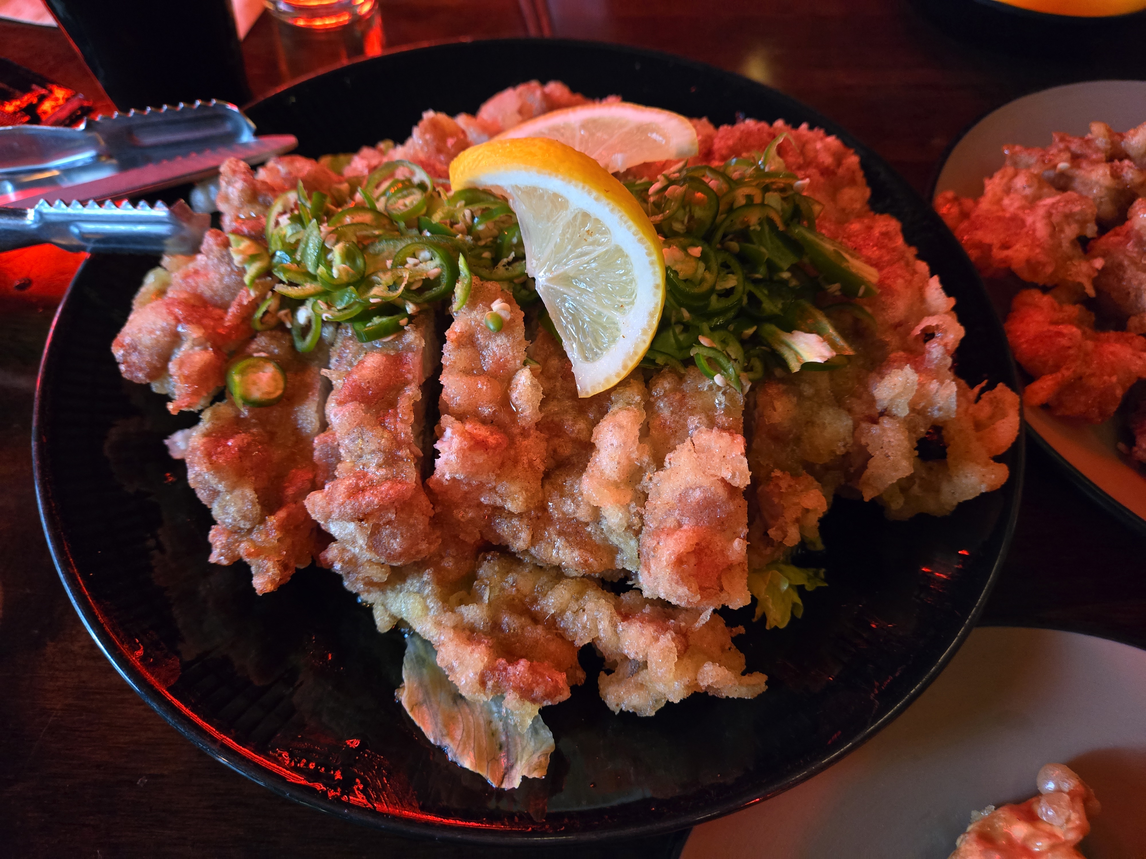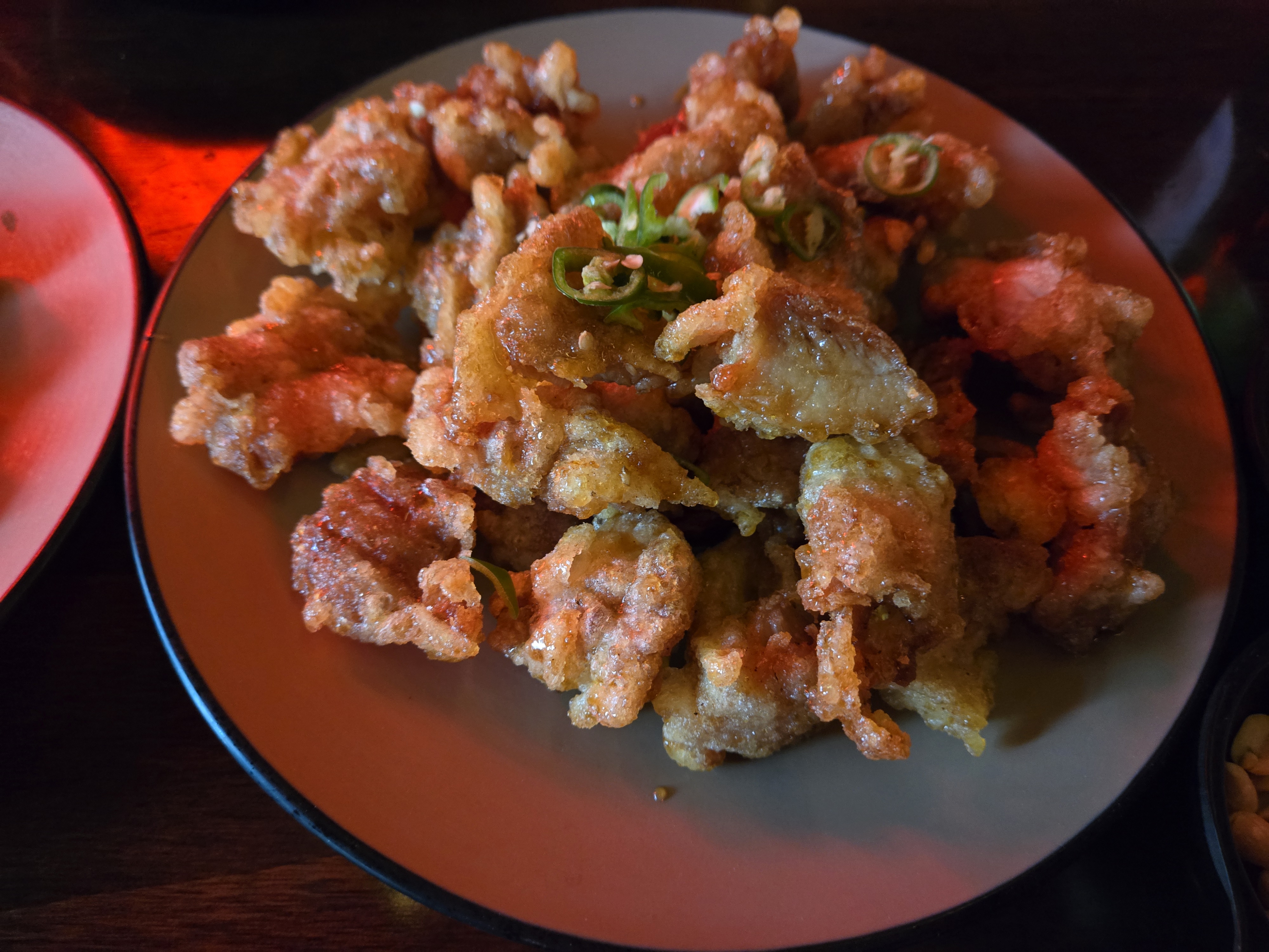 바삭하게 튀긴 닭 위에 송송 썬 고추, 얇게 저민 레몬이 듬뿍 얹혀 있습니다. 겉은 바삭하고 속은 촉촉한 튀김은 이미 훌륭했지만, 거기에 레몬의 산미가 더해져 느끼함은 전혀 없이 상큼하게 넘어갑니다. 함께 마신 테라 맥주와의 조합은 그야말로 환상의 궁합. 튀김요리임에도 무겁지 않고, 마지막 한 조각까지 맛있게 즐길 수 있었습니다.