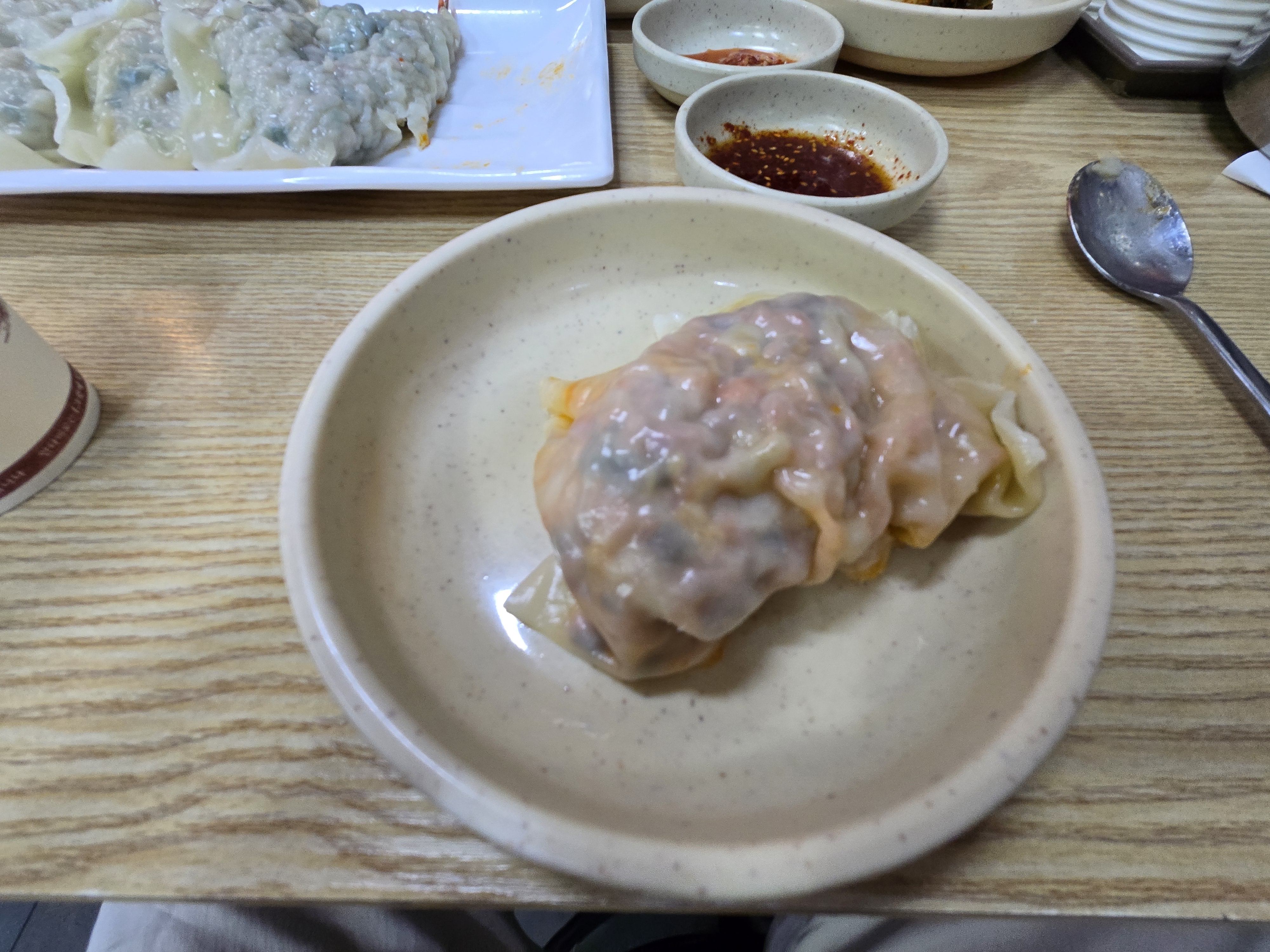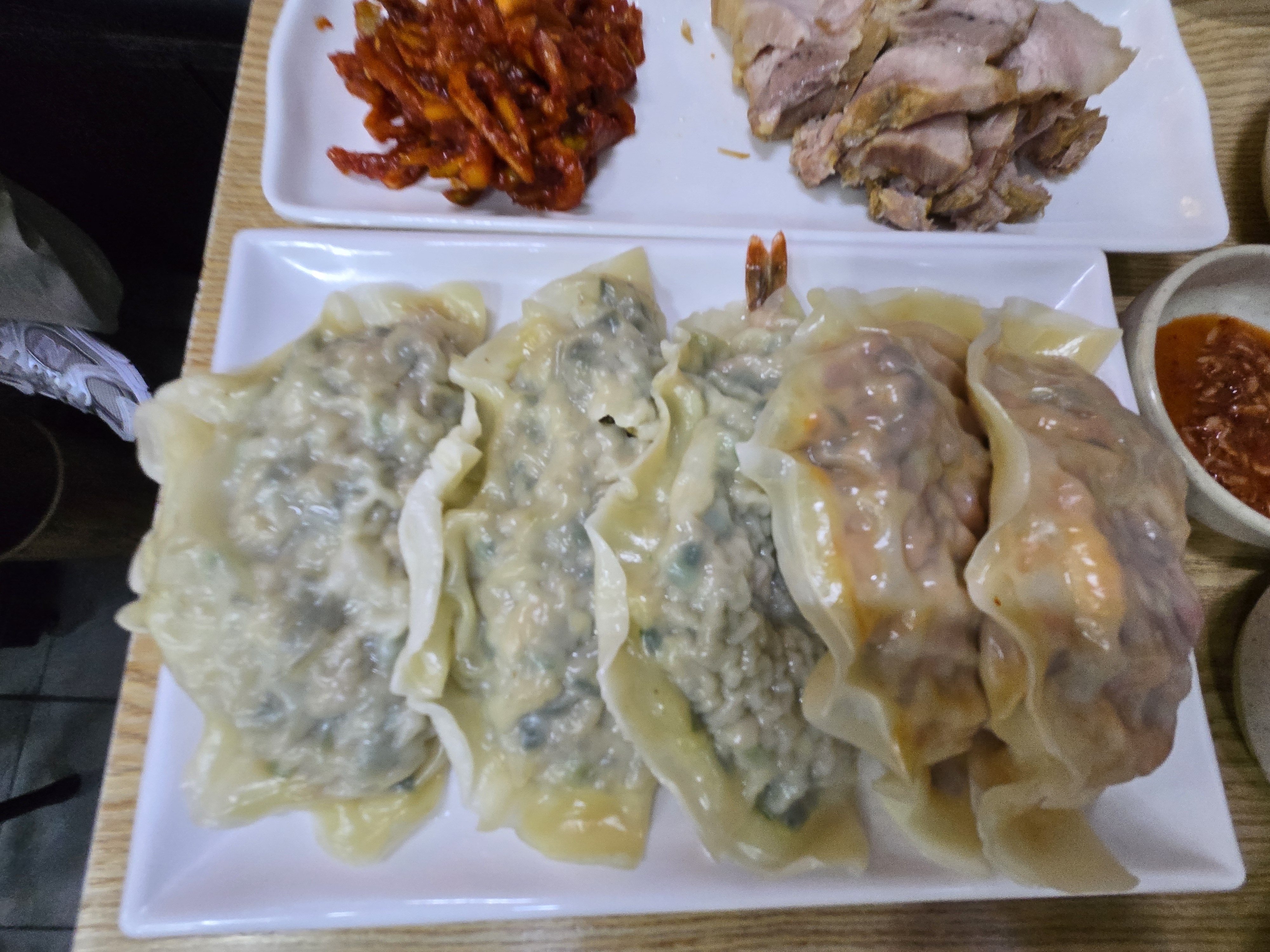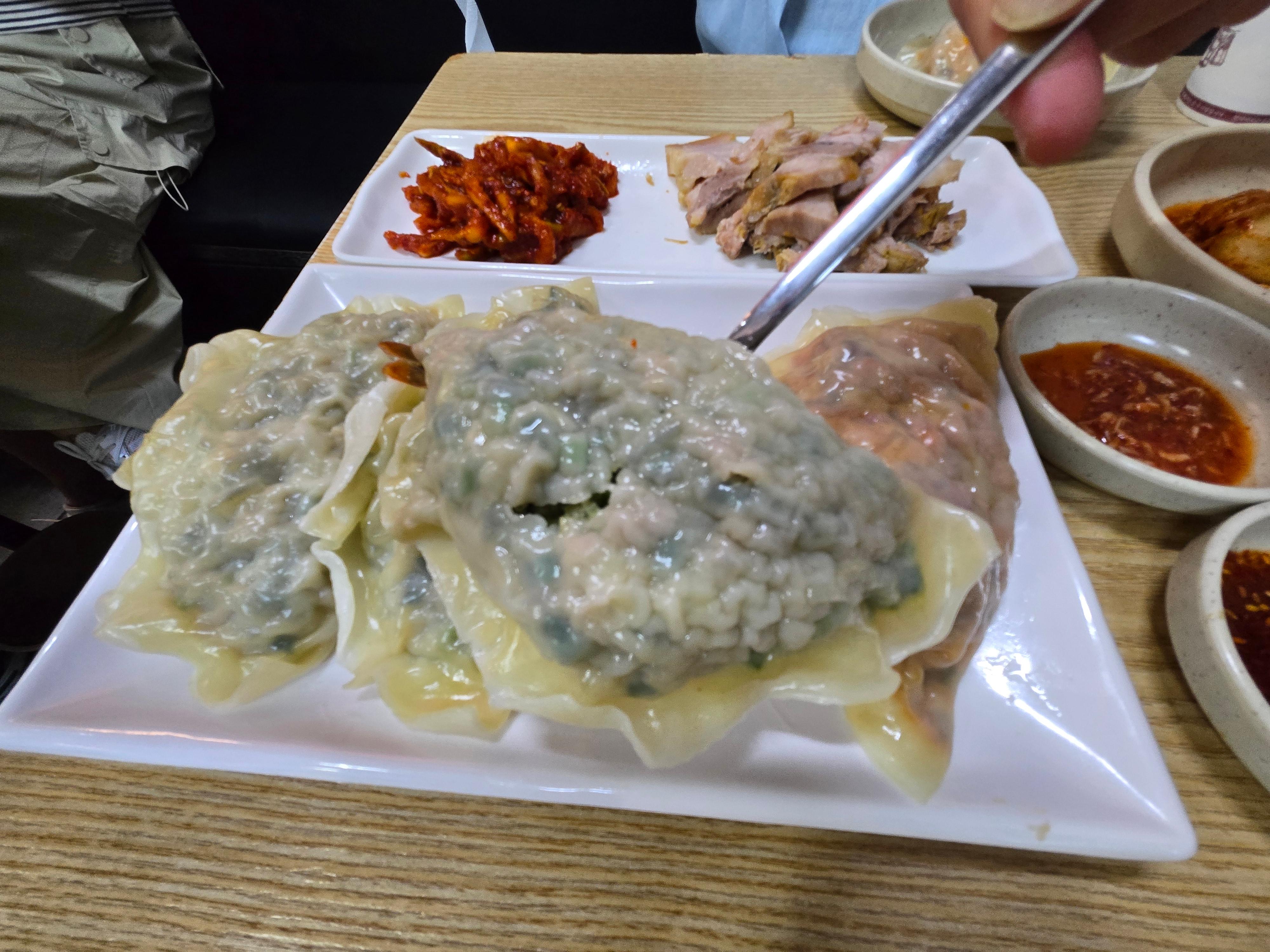 “칼국수엔 수육이지!” 반 접시 구성이라 부담 없이 곁들일 수 있었고, 잡내 없는 깔끔한 맛에 무채 무침을 곁들이면 진짜 찰떡궁합. 국수 한 젓가락, 만두 한 입, 수육 한 점이 완벽한 조합을 이루며 과음 후 속을 다스려줬습니다.