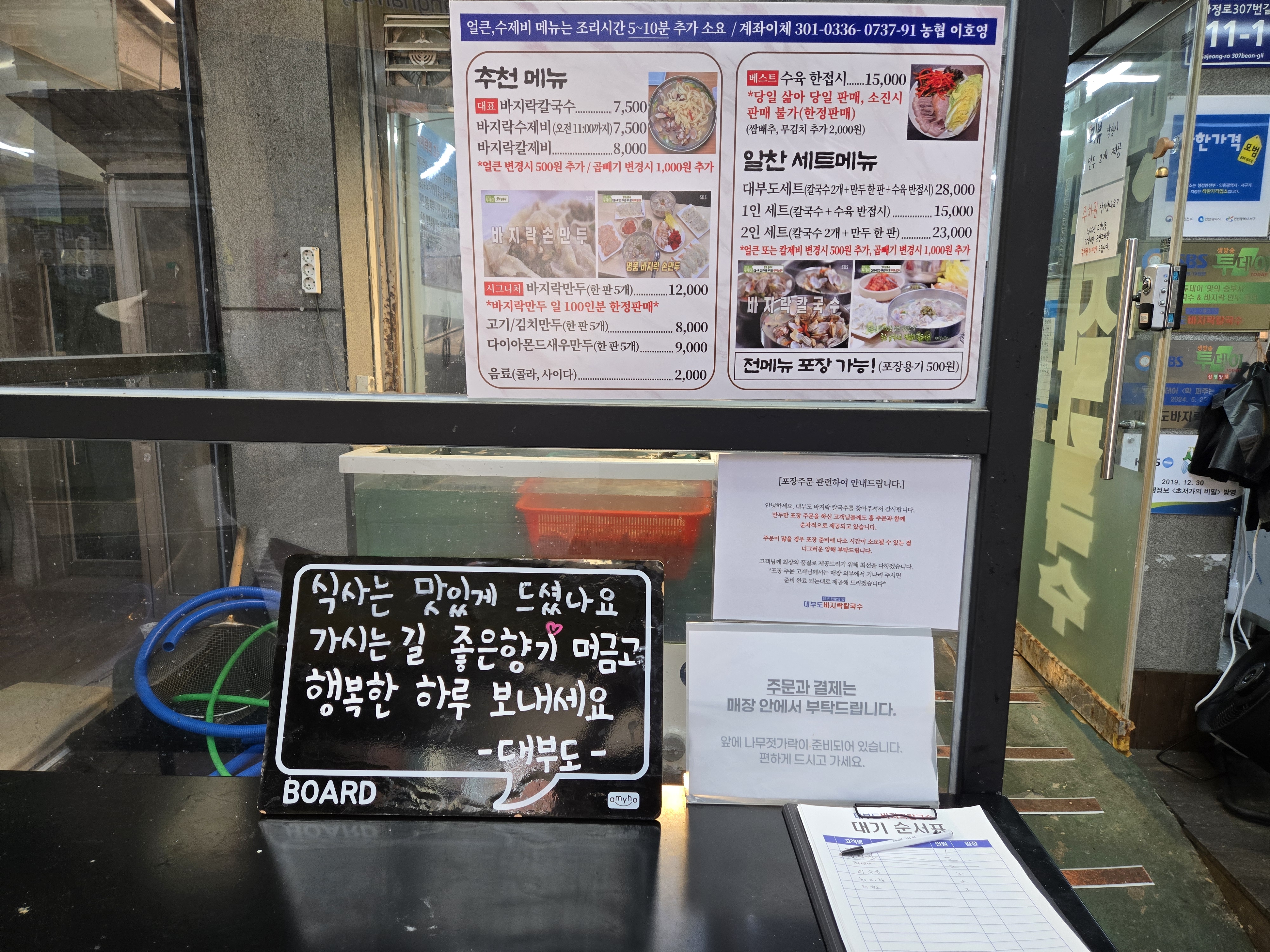 그때 인스타에서 자주 봤던 맛집이 생각났어요. 바로 인천 강남시장 안에 위치한 ‘대부도바지락칼국수 본점’. 생방송 투데이에도 소개된 인천 칼국수 맛집이라길래, 이 기회에 직접 다녀왔습니다.