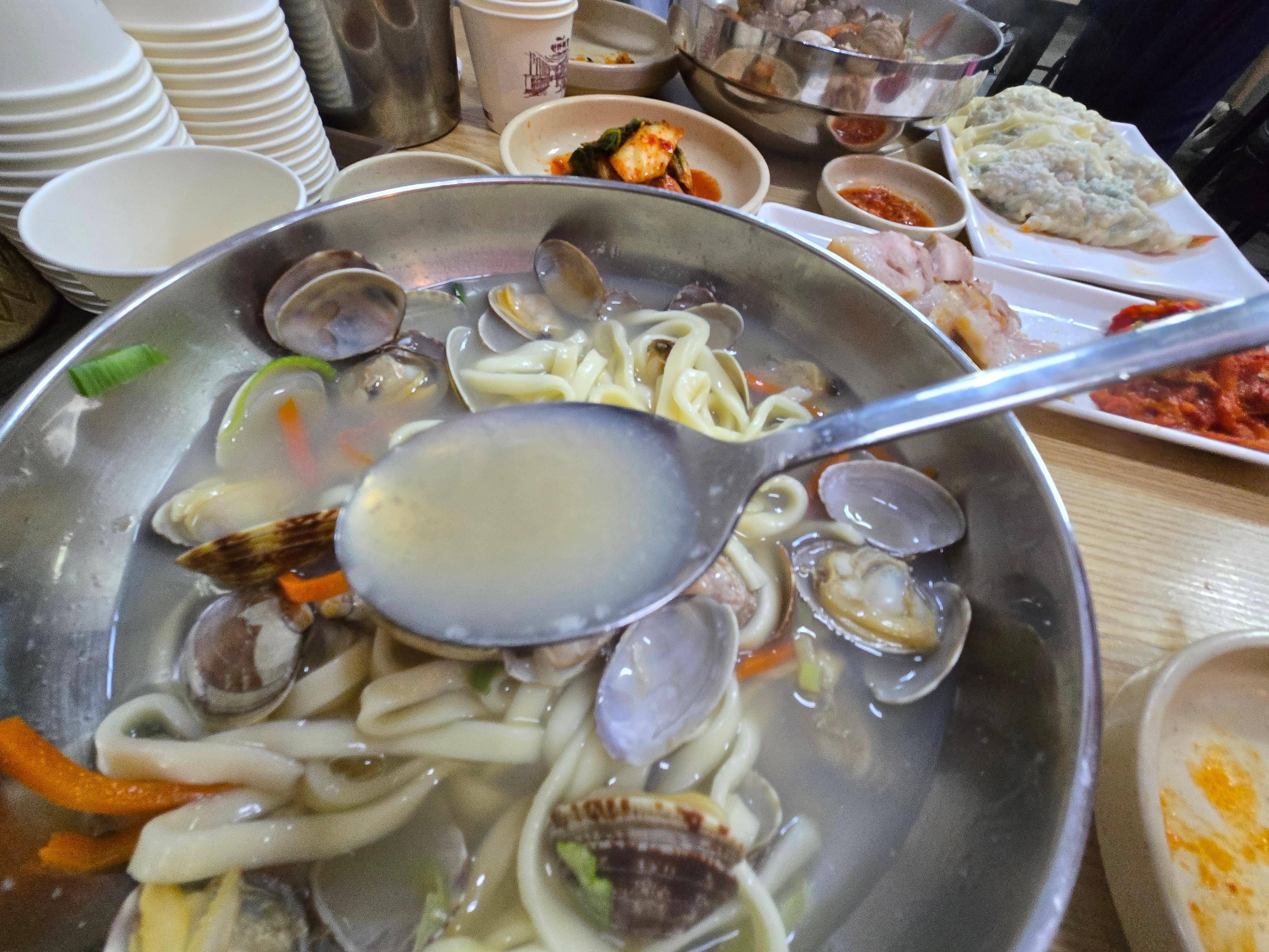 자가제면으로 만든 칼국수 면발은 쫄깃하고 탱글탱글해서 씹는 맛이 살아 있어요. 무엇보다 국물이 예술입니다. 바지락의 깊은 감칠맛이 맑고 개운하게 우러나 있어, 한 숟가락에 해장이 되는 느낌!