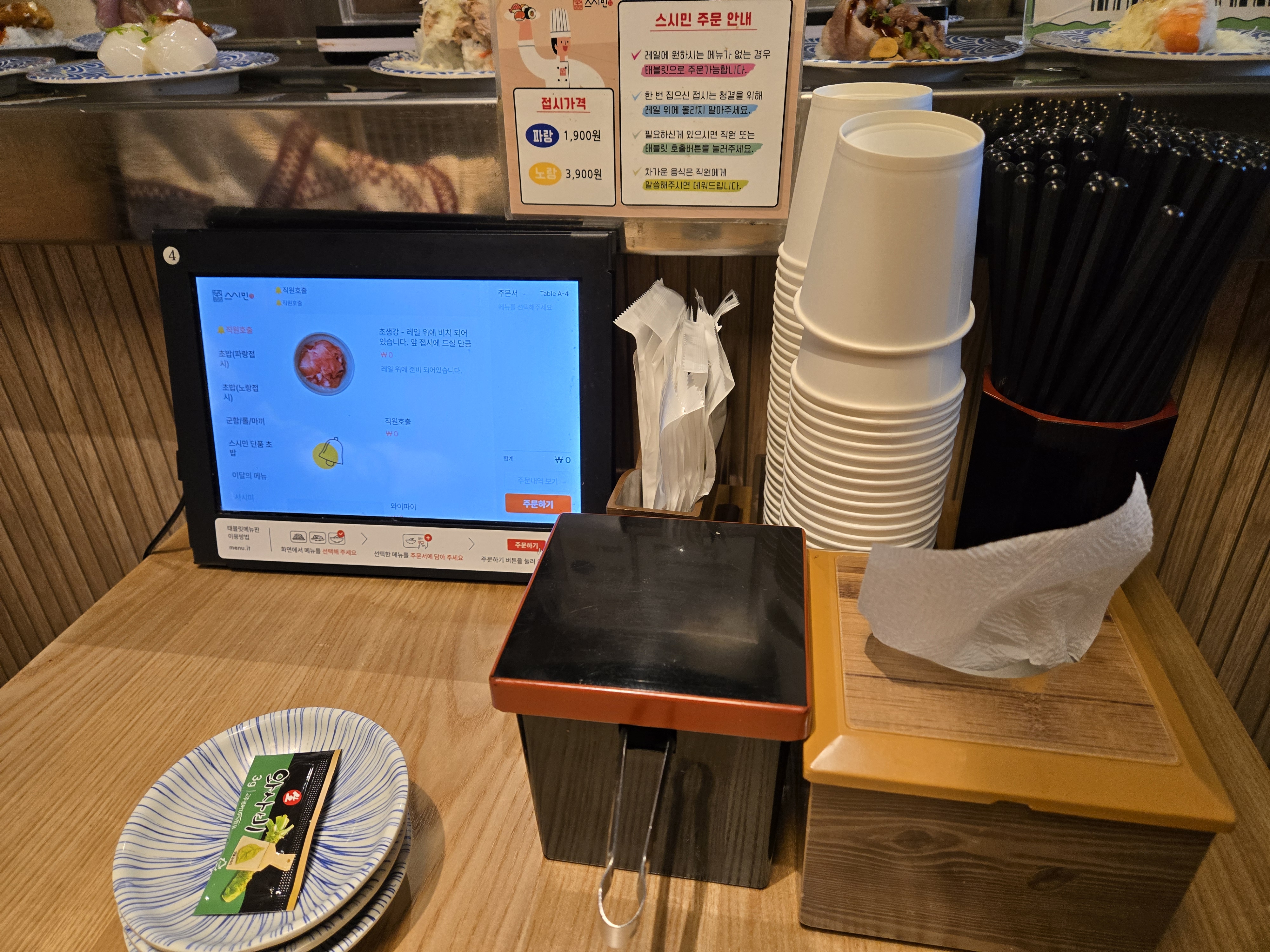 일반적인 회전초밥집에서는 돌아다니는 초밥을 눈으로 보고 바로 집어 들게 되어있죠. 그런데 인천 스시민은 여기에 키오스크 주문 시스템을 추가해서 신선함과 편리함을 동시에 잡았습니다.