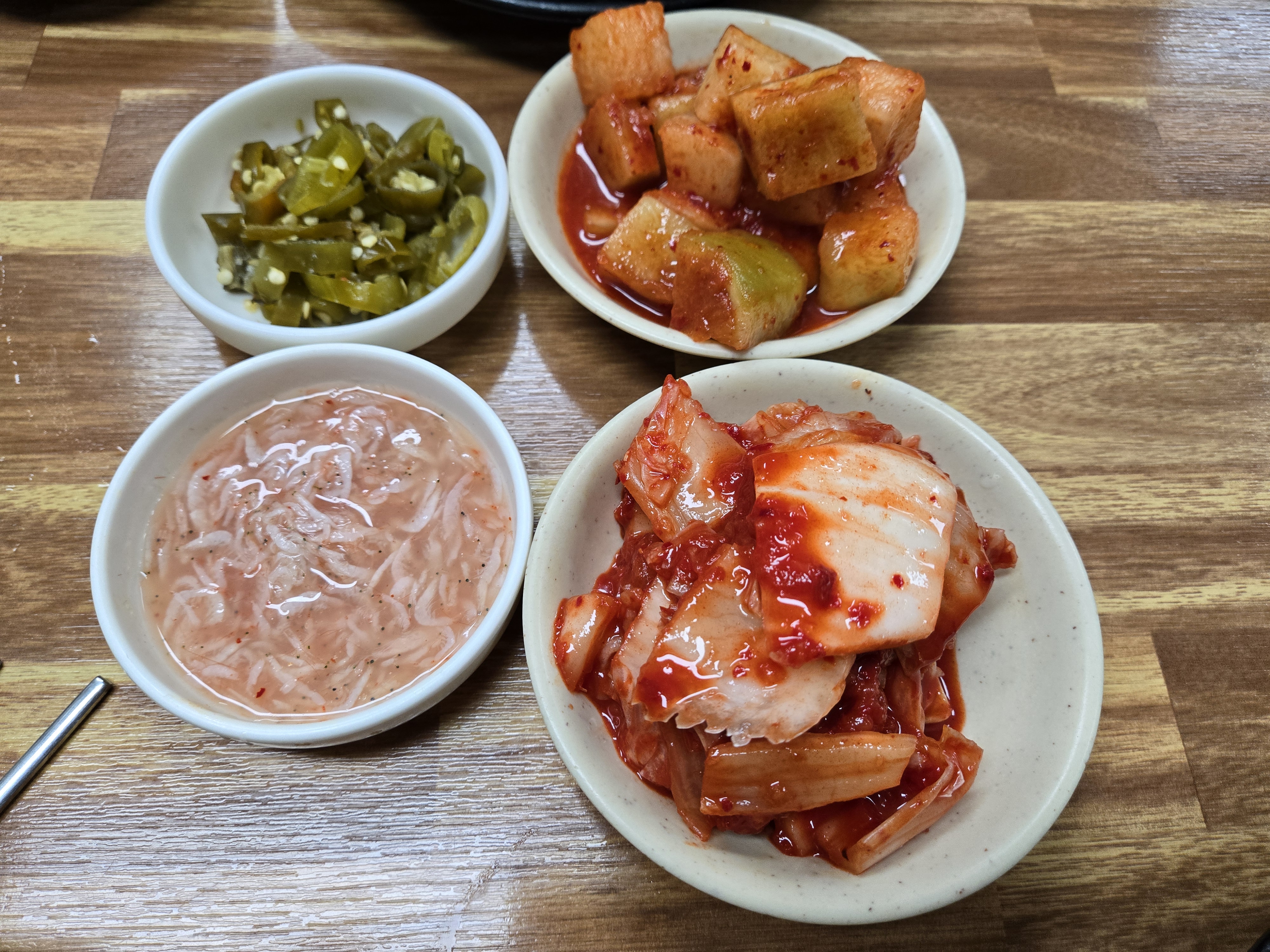 금선식당의 기본 반찬은 깍두기, 배추김치, 젓갈, 절임고추로 구성되어 있습니다. 모두 직접 담근 듯한 정성스러운 맛이 느껴졌습니다. 특히 깍두기는 아삭한 식감과 새콤달콤한 맛이 국밥과 정말 잘 어울렸고, 배추김치는 국밥과 함께 먹을 때 감칠맛을 한층 끌어올려주었습니다.