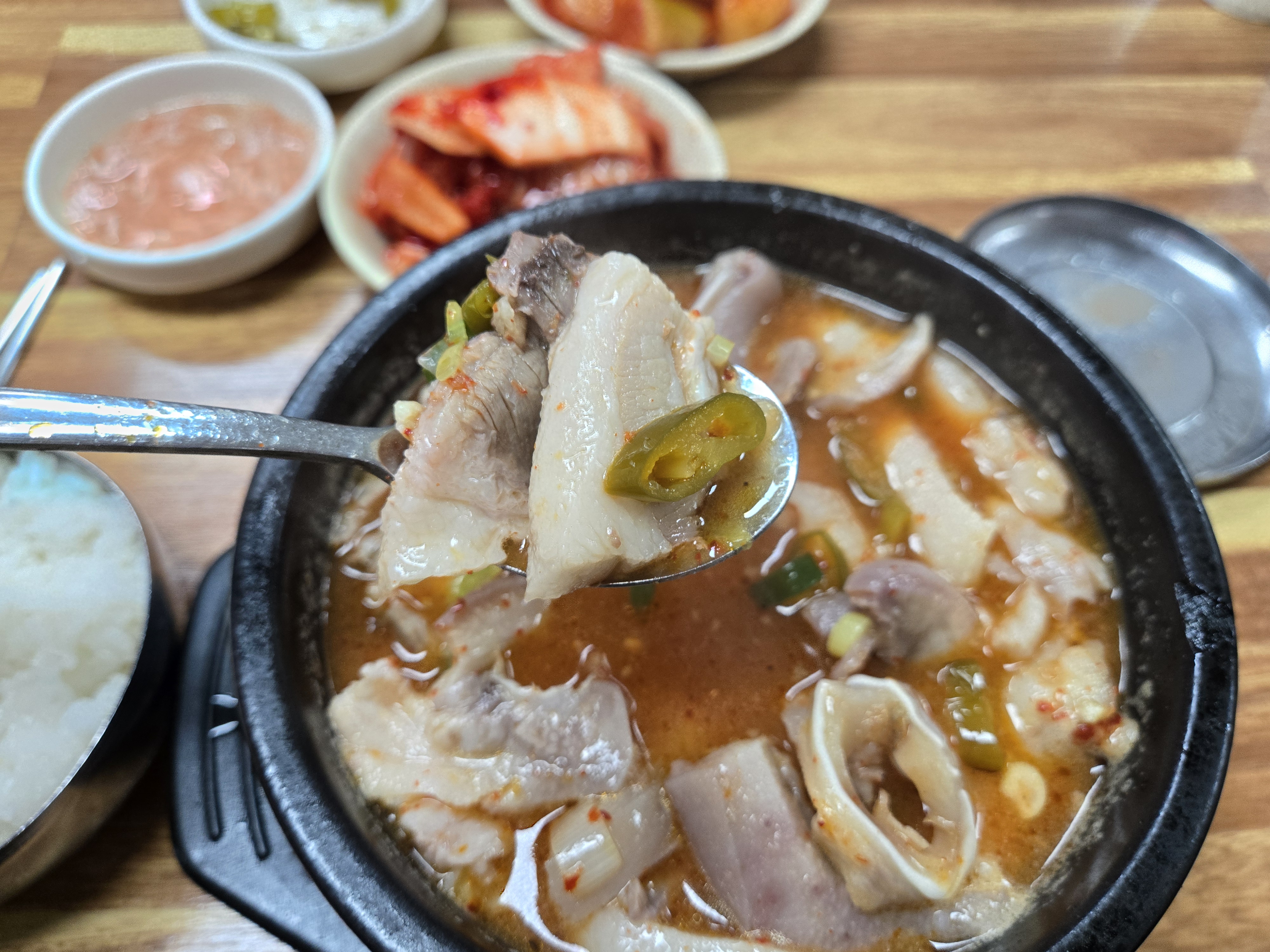 개인적으로는 다진 양념을 풀고 청양고추절임을 추가로 넣어 매콤하게 먹는 걸 좋아합니다. 약간 식은 국물이라도 다진 양념과 양념을 풀어주면 따뜻한 느낌이 살아나고, 고기와 순대도 더 풍미가 깊어집니다.