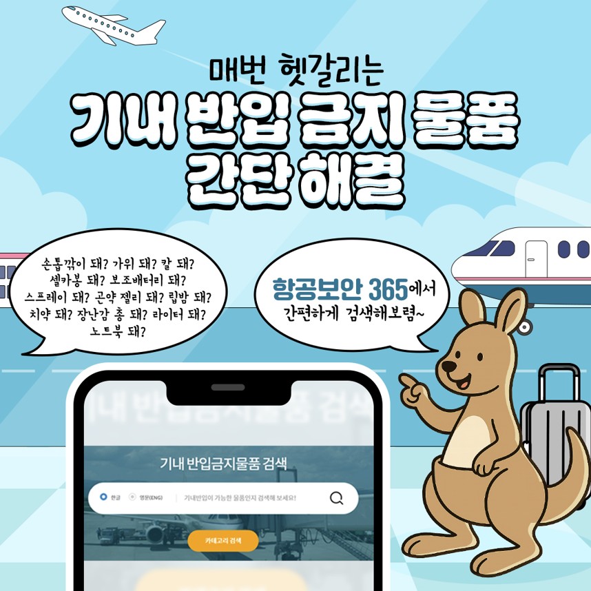 매번 공항 보안 검색대 앞에서 “이건 들고 탈 수 있나?” 하고 망설이셨던 경험, 있으시죠? ‘항공보안365’ 서비스를 이용하면 기내 반입 금지 물품을 아주 쉽게 검색할 수 있어요. 손톱깎이, 스프레이, 라이터, 보조배터리 같은 애매한 물품들도 정확히 확인할 수 있답니다. 간단히 검색창에 입력만 하면 되니, 출발 전 빠르게 체크하고 마음 편하게 공항으로 향하세요.