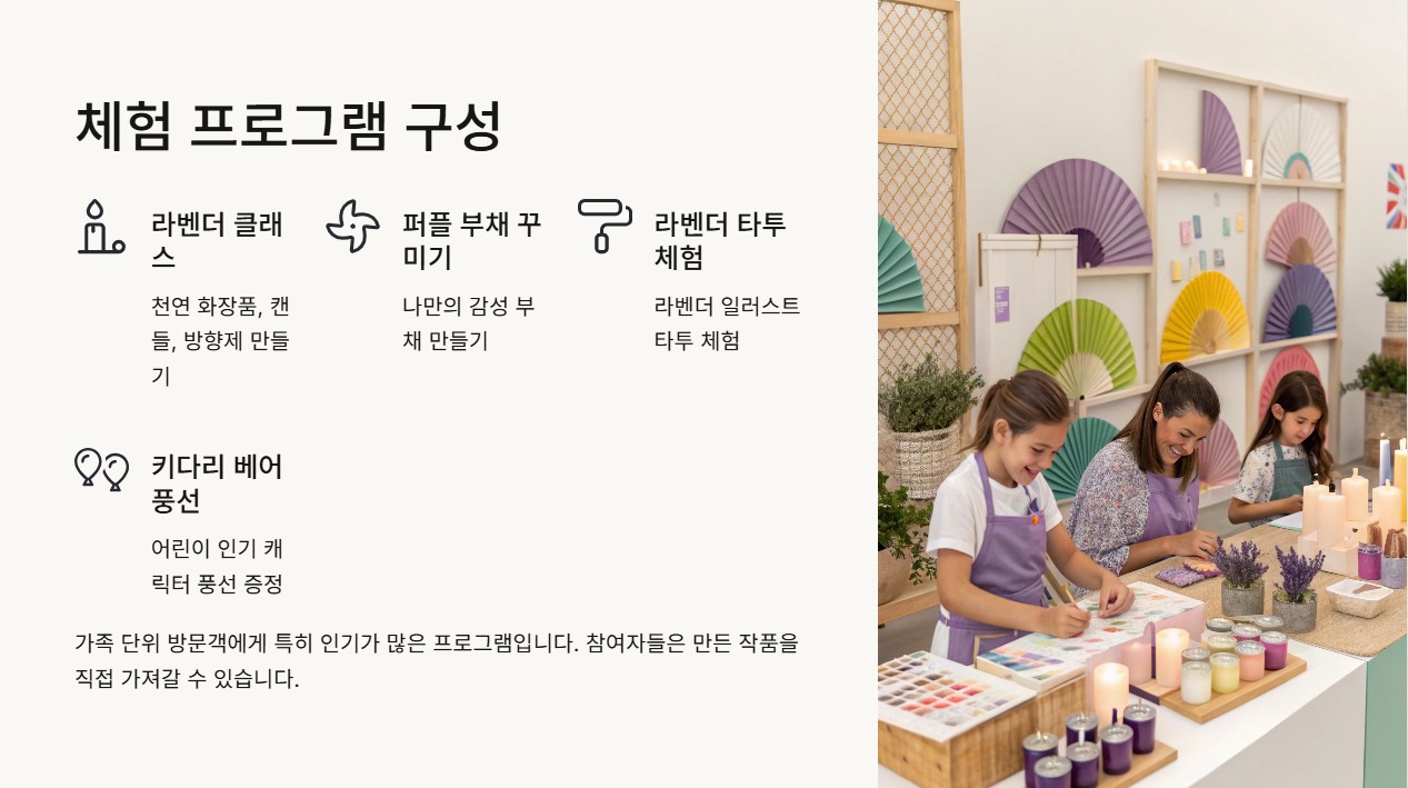 - 굿즈 마켓: 라벤더 비누, 방향제, 오일 등 수공예품