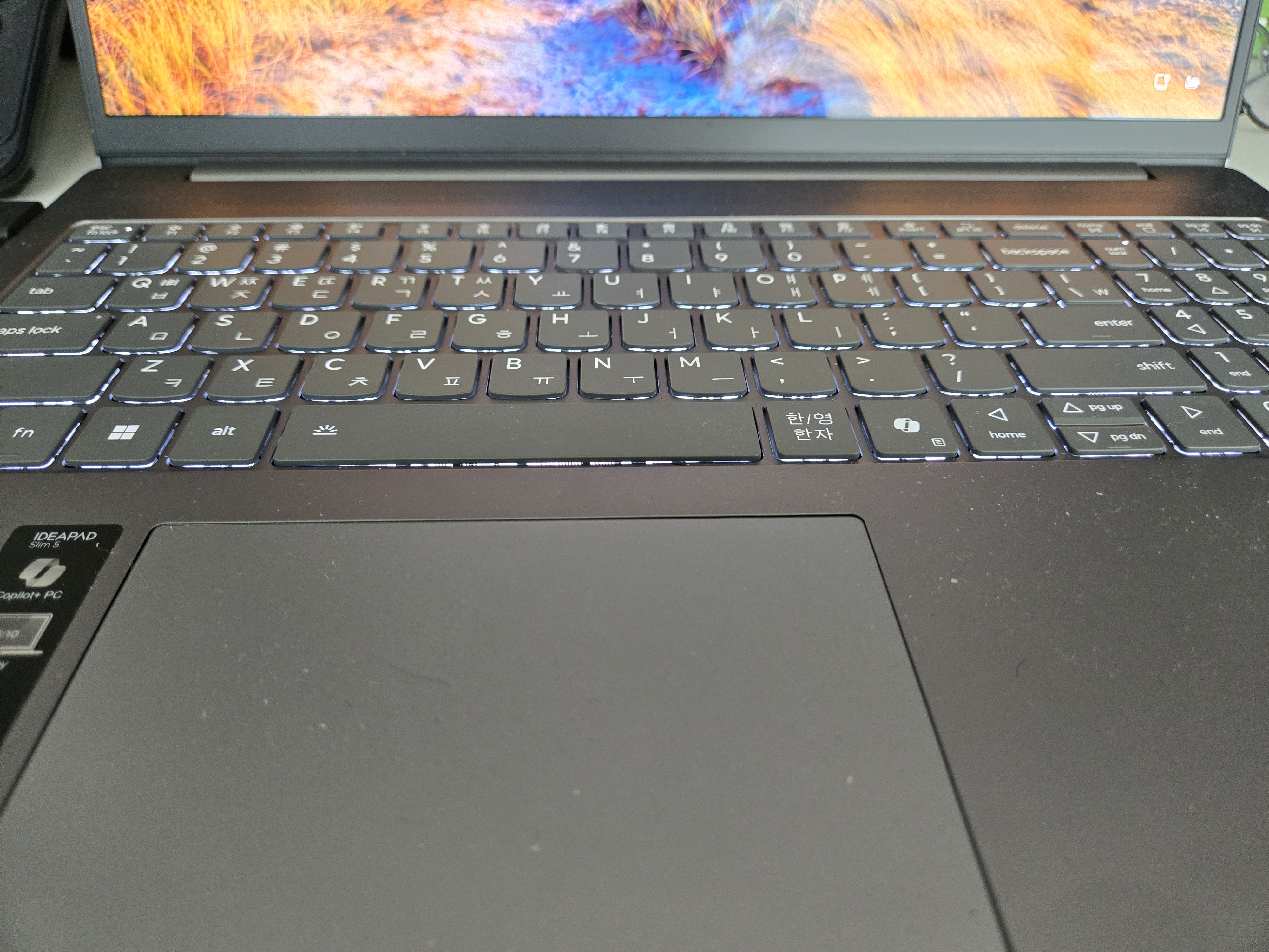 Lenovo IdeaPad Slim 5 16AKP10의 키보드는 텐키패드가 포함된 풀배열로, 숫자 입력이 많은 업무에 특히 유용합니다. 키감은 부드러우면서도 반발력이 적당해 장시간 타이핑에도 피로감이 덜했고, 키 간격도 넉넉하게 배치되어 있어 오타도 줄어드는 느낌이었습니다. 야간 작업에 유용한 백라이트 기능도 기본 탑재되어 있었어요.